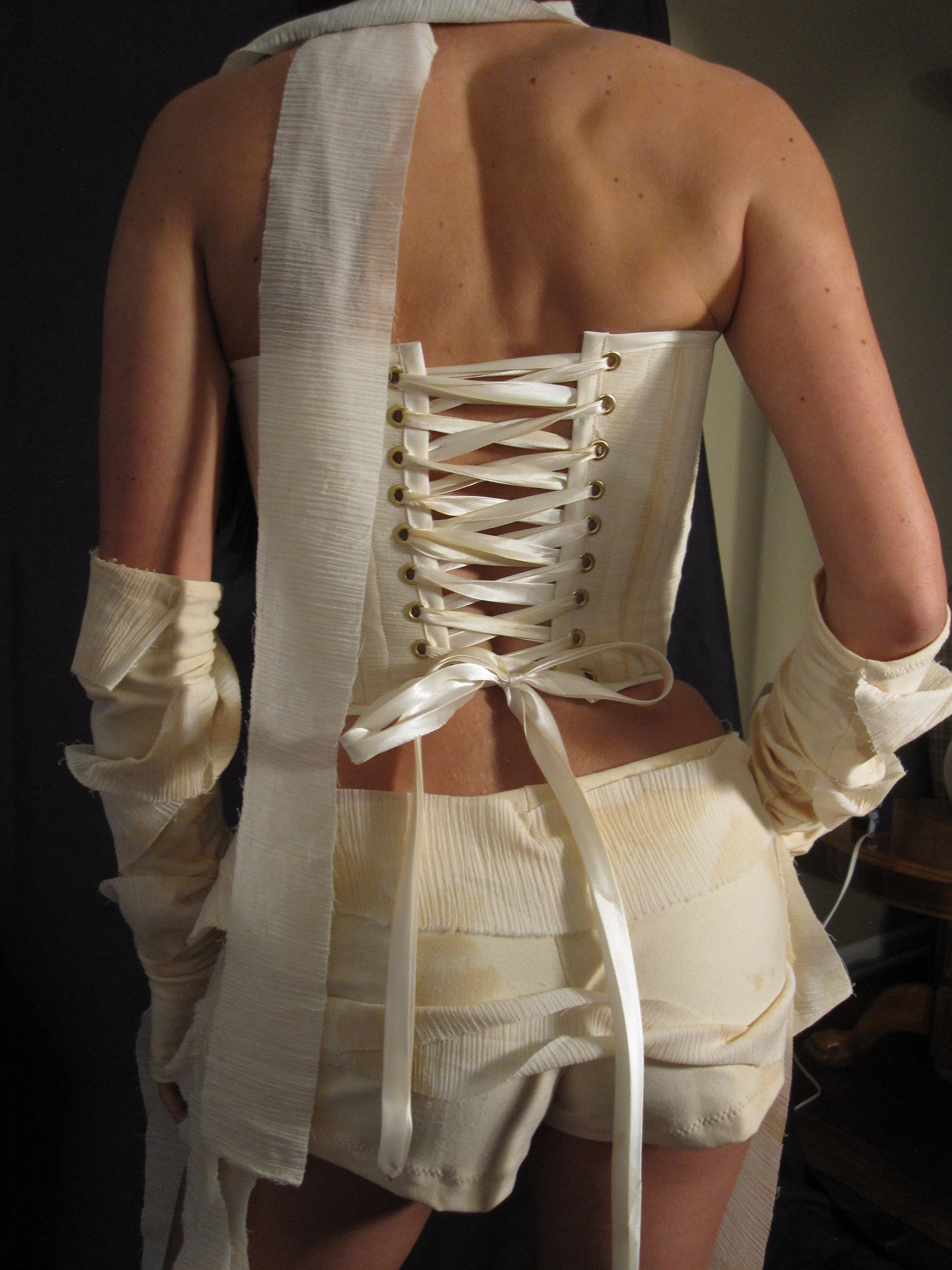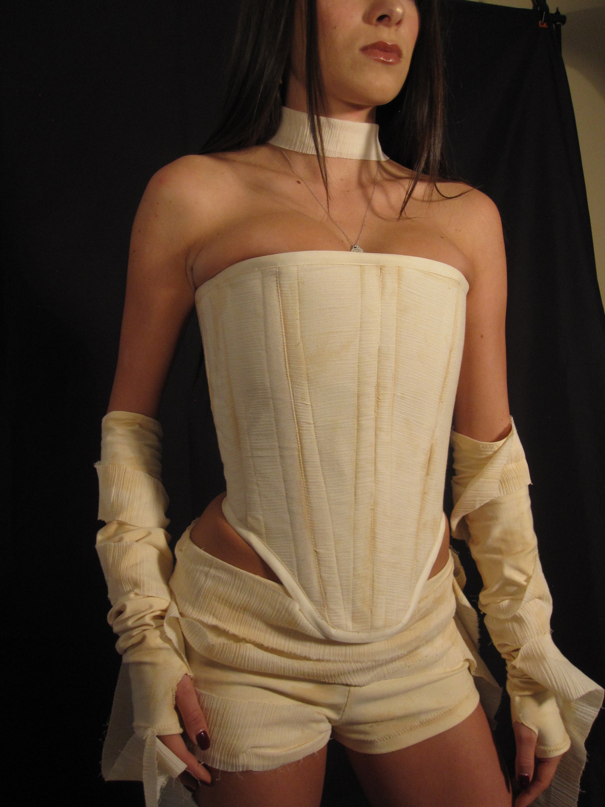 HANDMADE Halloween costume includes CORSET, MICRO SHORTS, & ARM WARMERS WITH TUMB HOLES.