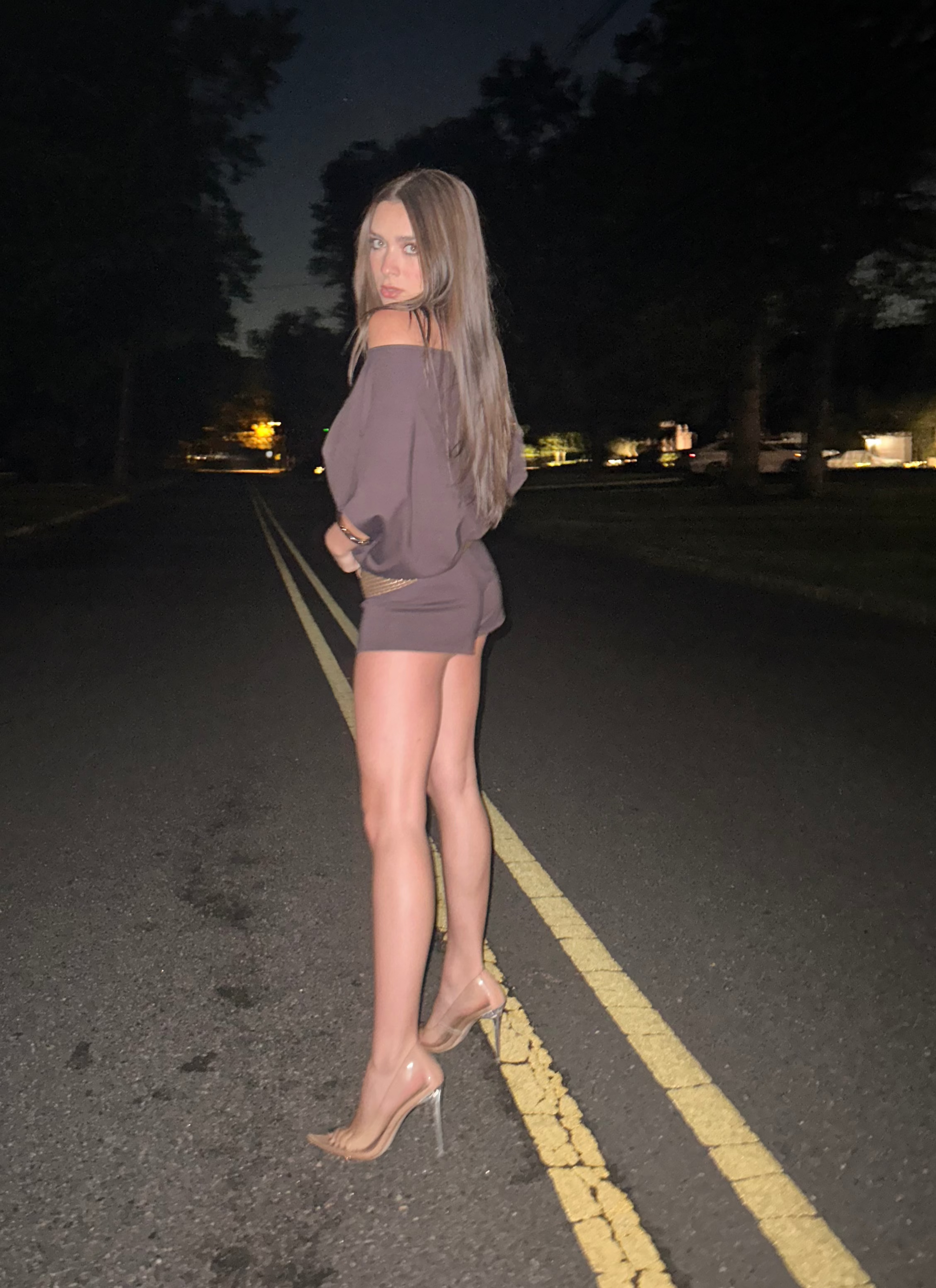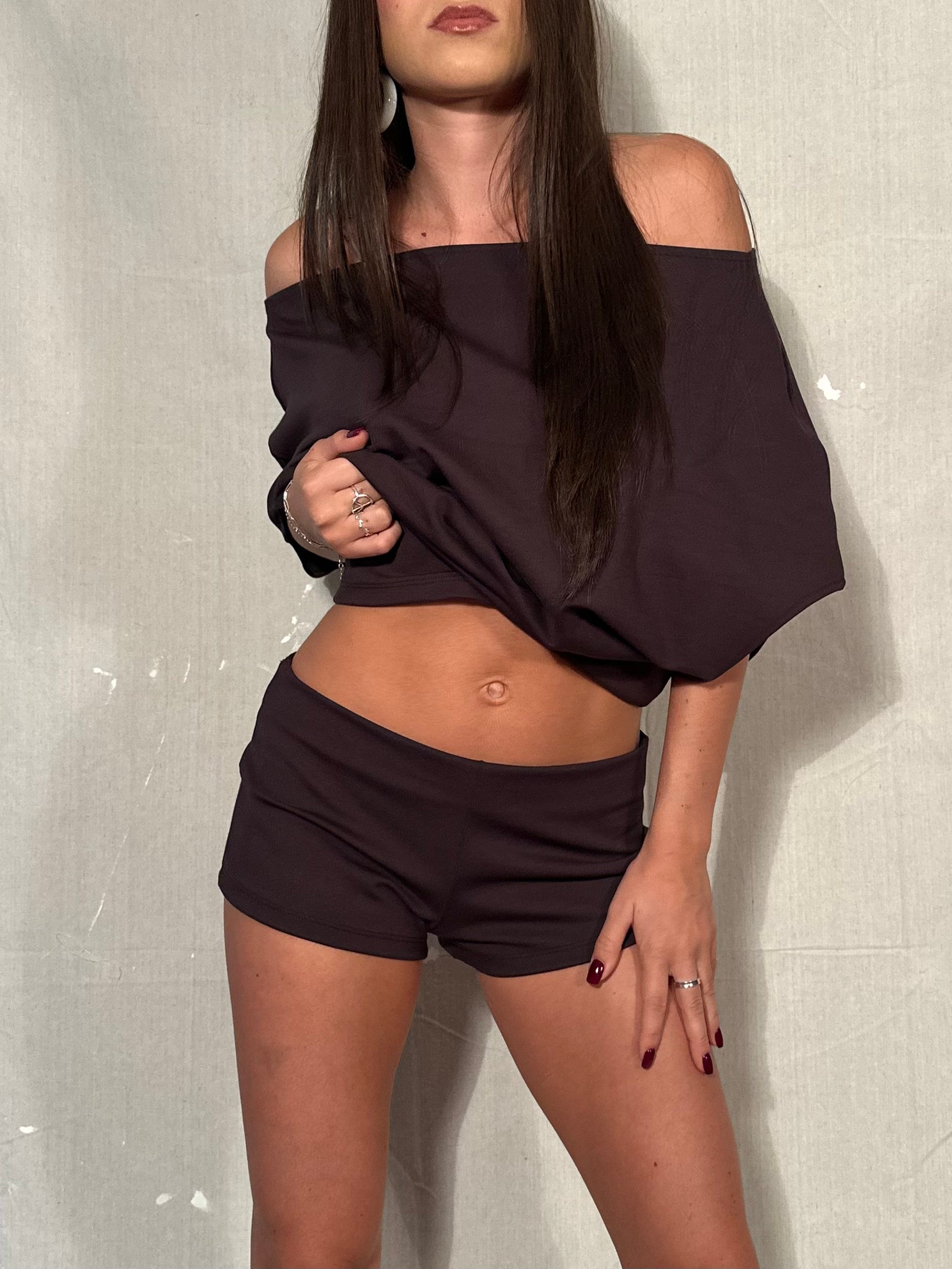 Slouch off the shoulder top and mid/low rise micro shorts set. Constructed using medium weight brown jersey knit fabric. 95% Polyester 5% Spandex.