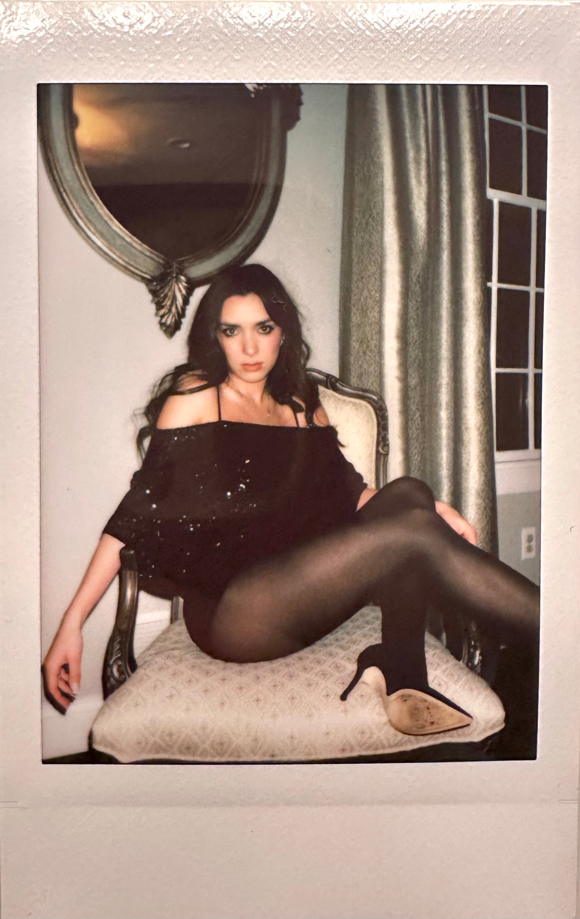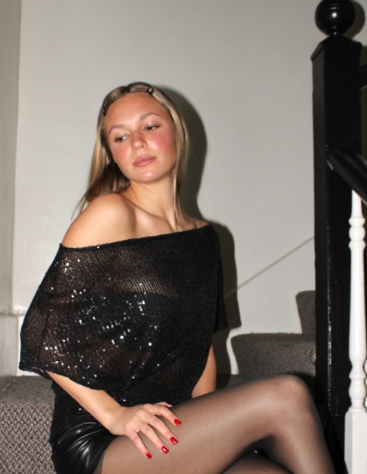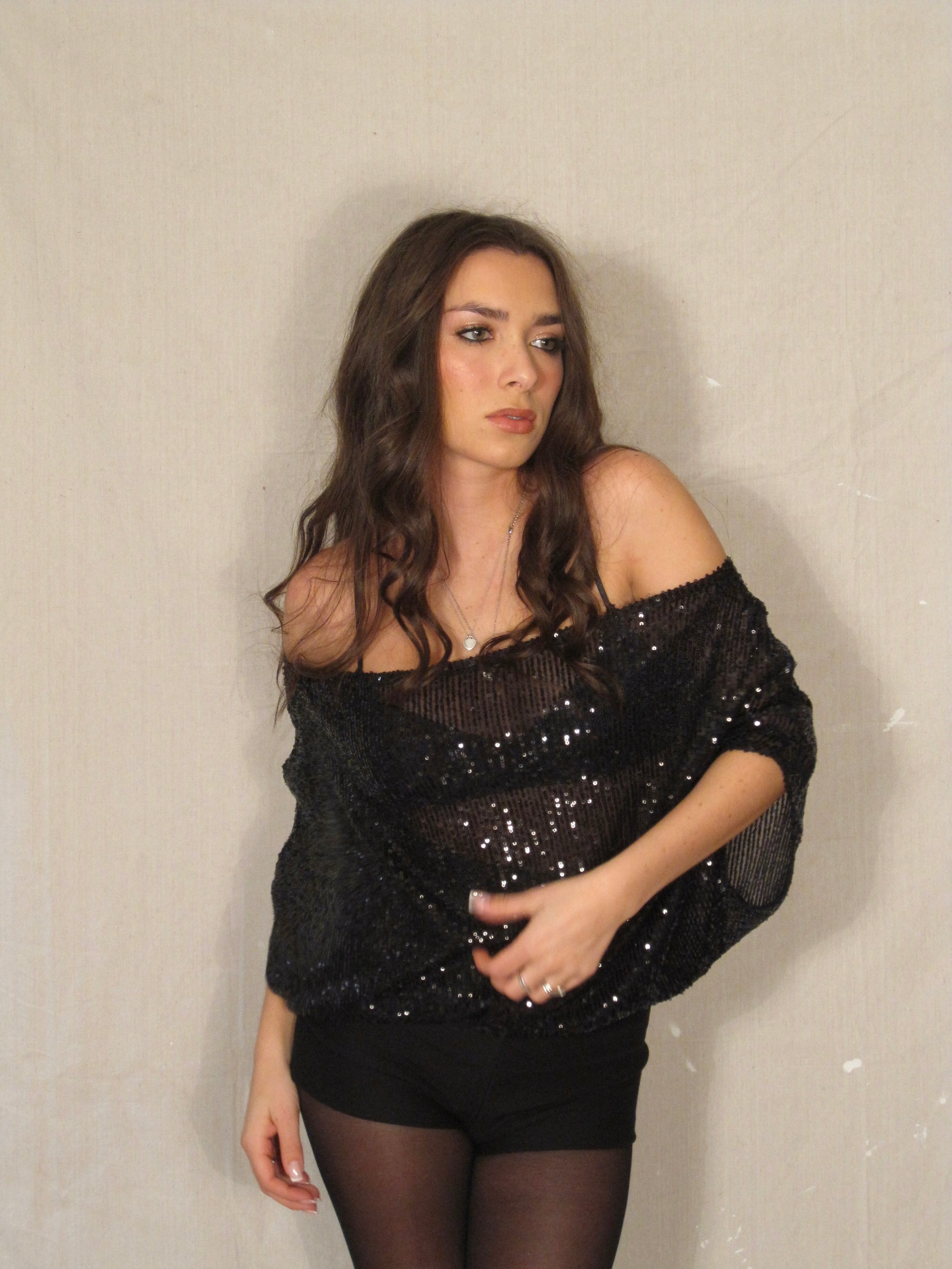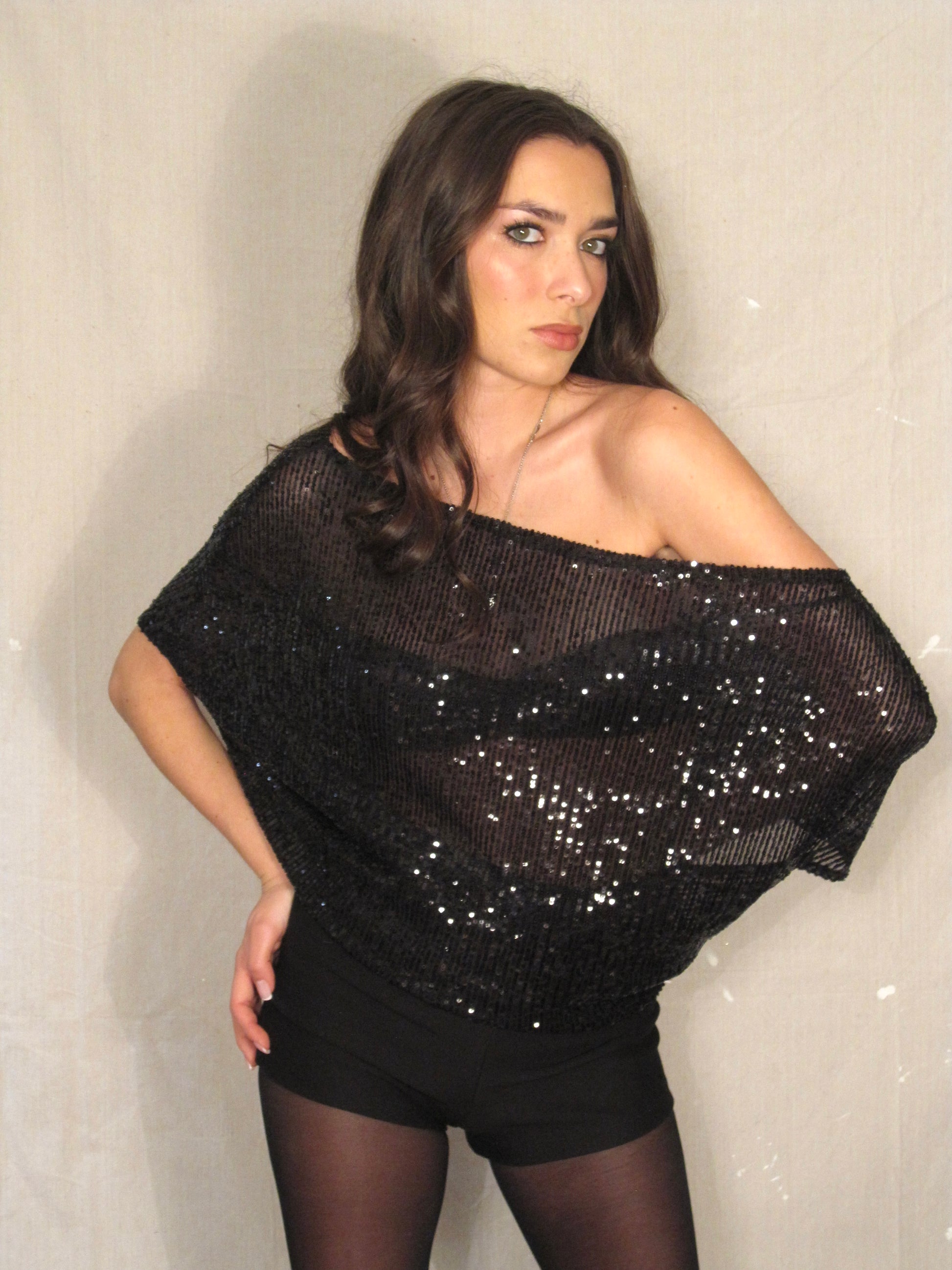 Off the shoulder slouch top constructed using black stretch mesh sequin fabric, 93% Polyester, 7% Spandex.