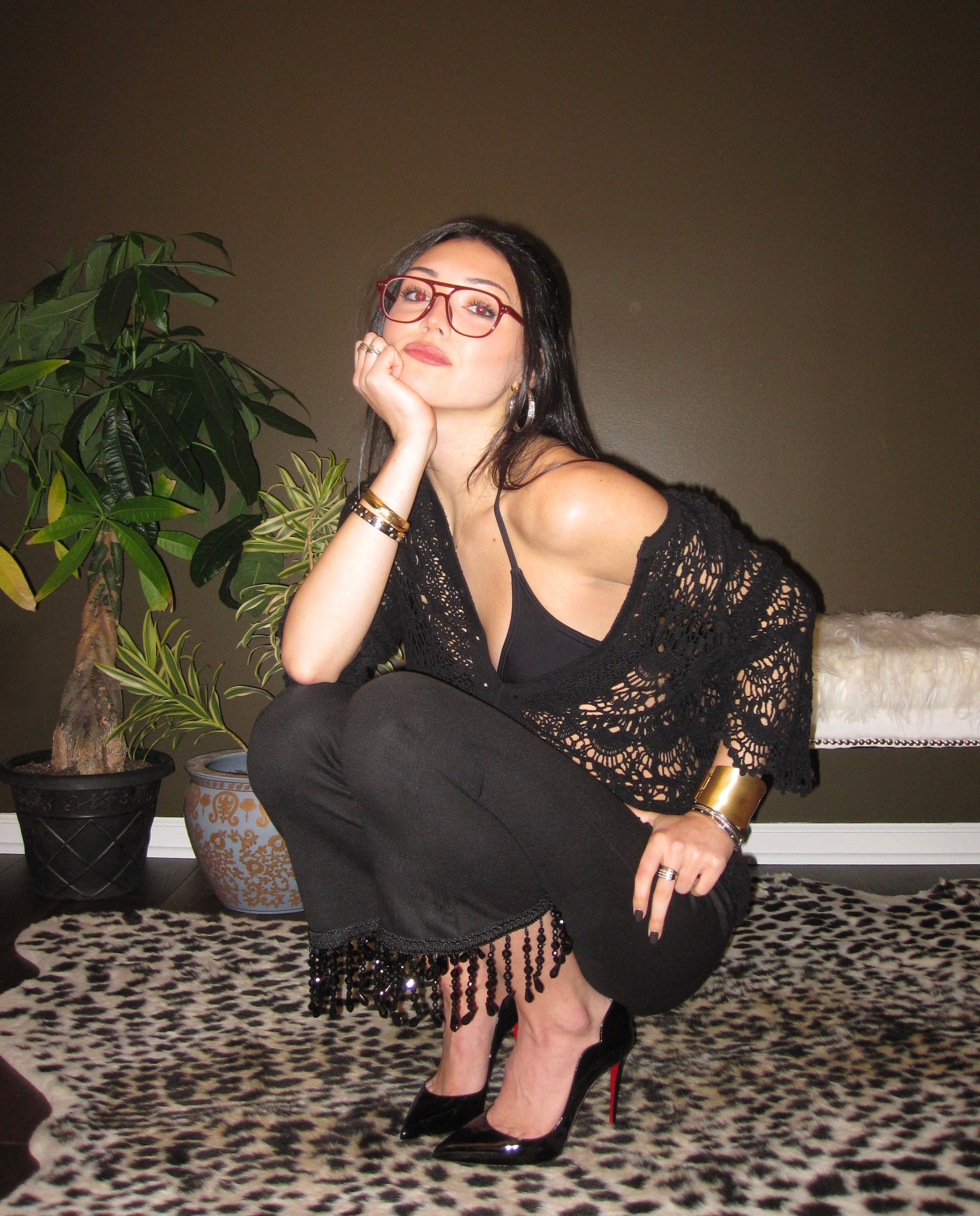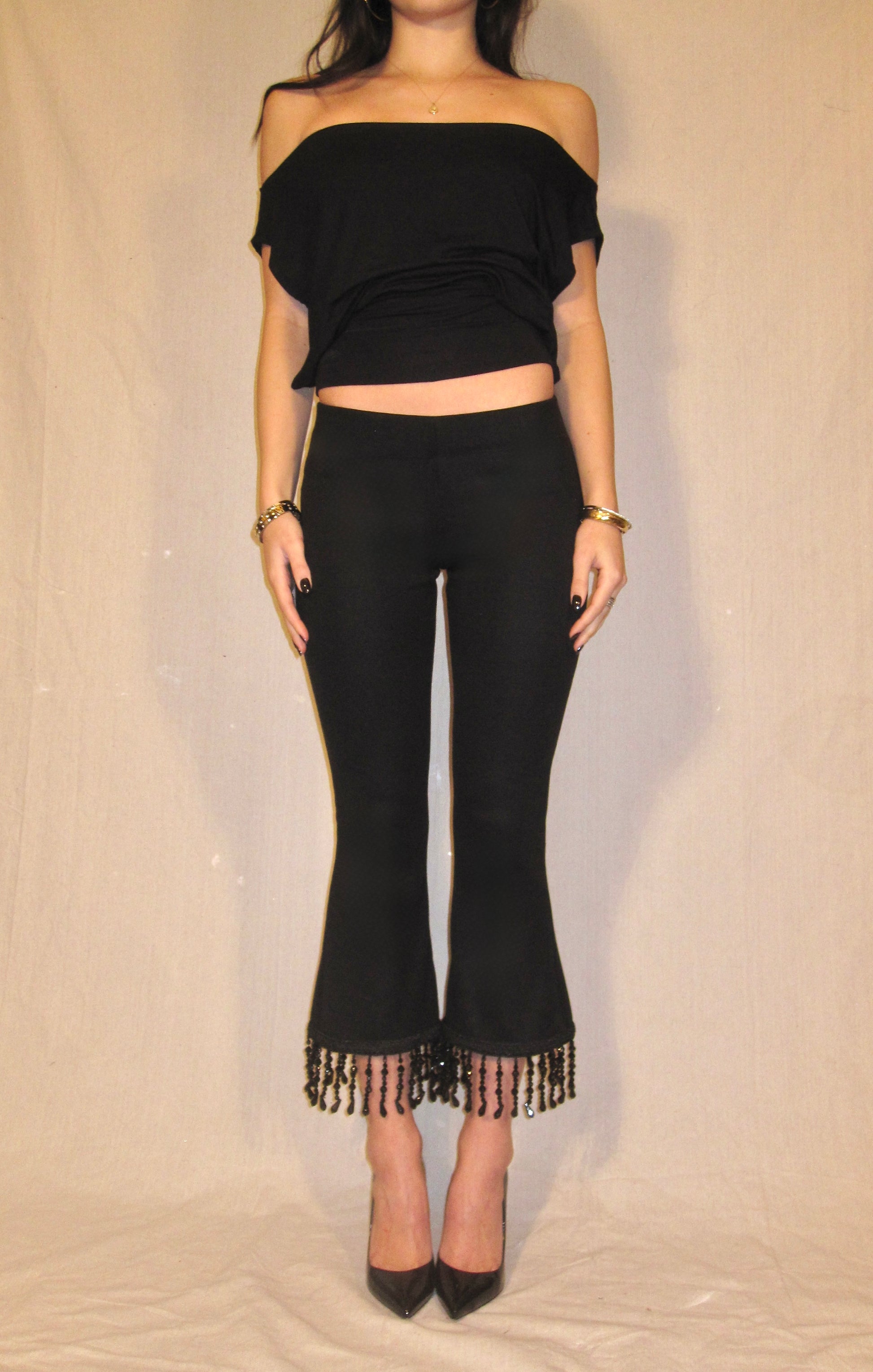 Black low rise capri pants, featuring an elastic waist band and hanging beaded trim. Constructed using 92% Cotton 8% Spandex fabric.