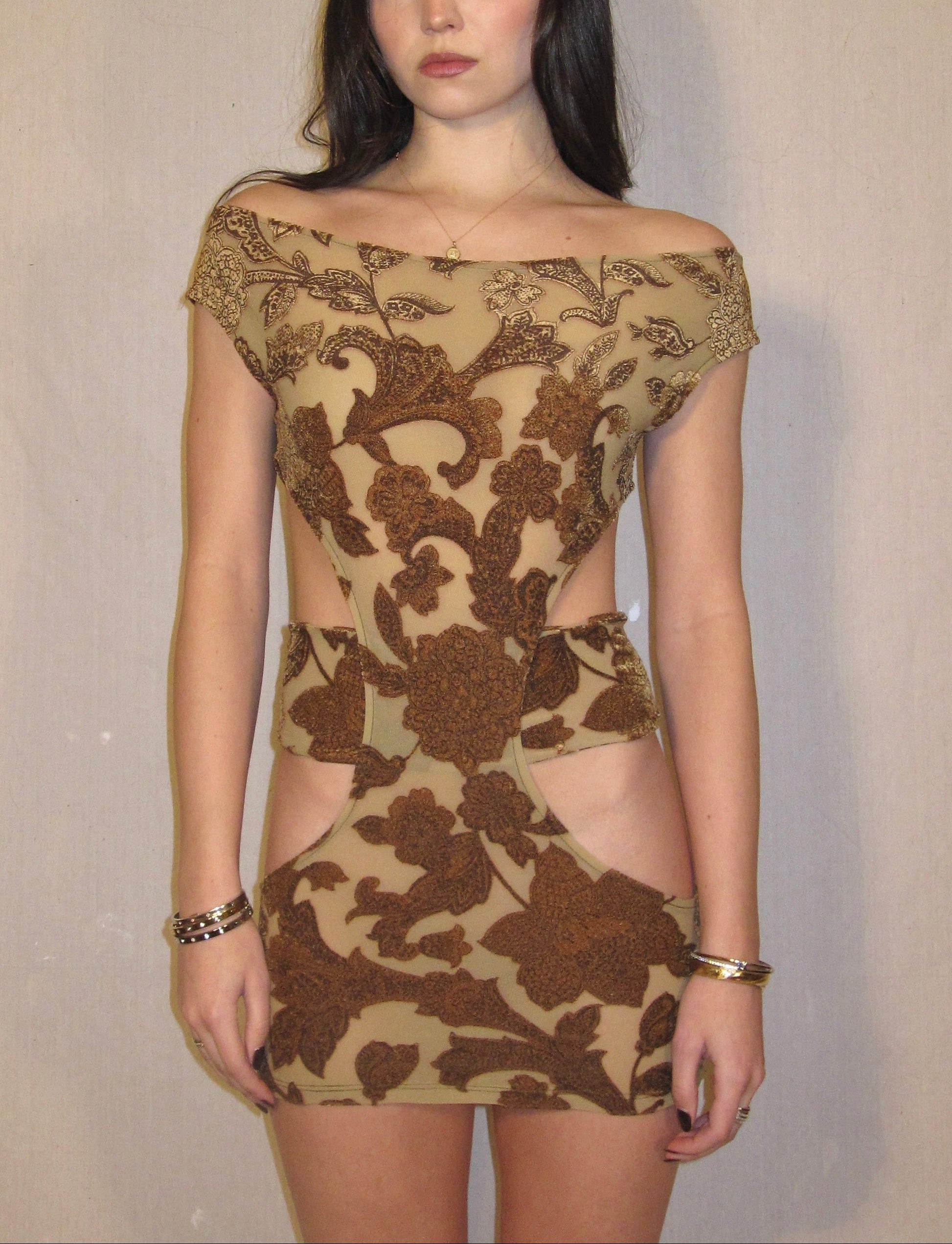 Brown and gold floral print mini dress, featuring side cut outs and built in belt around waist. Constructed using spandex and velvet fabric, 90% Polyester 10% Spandex.