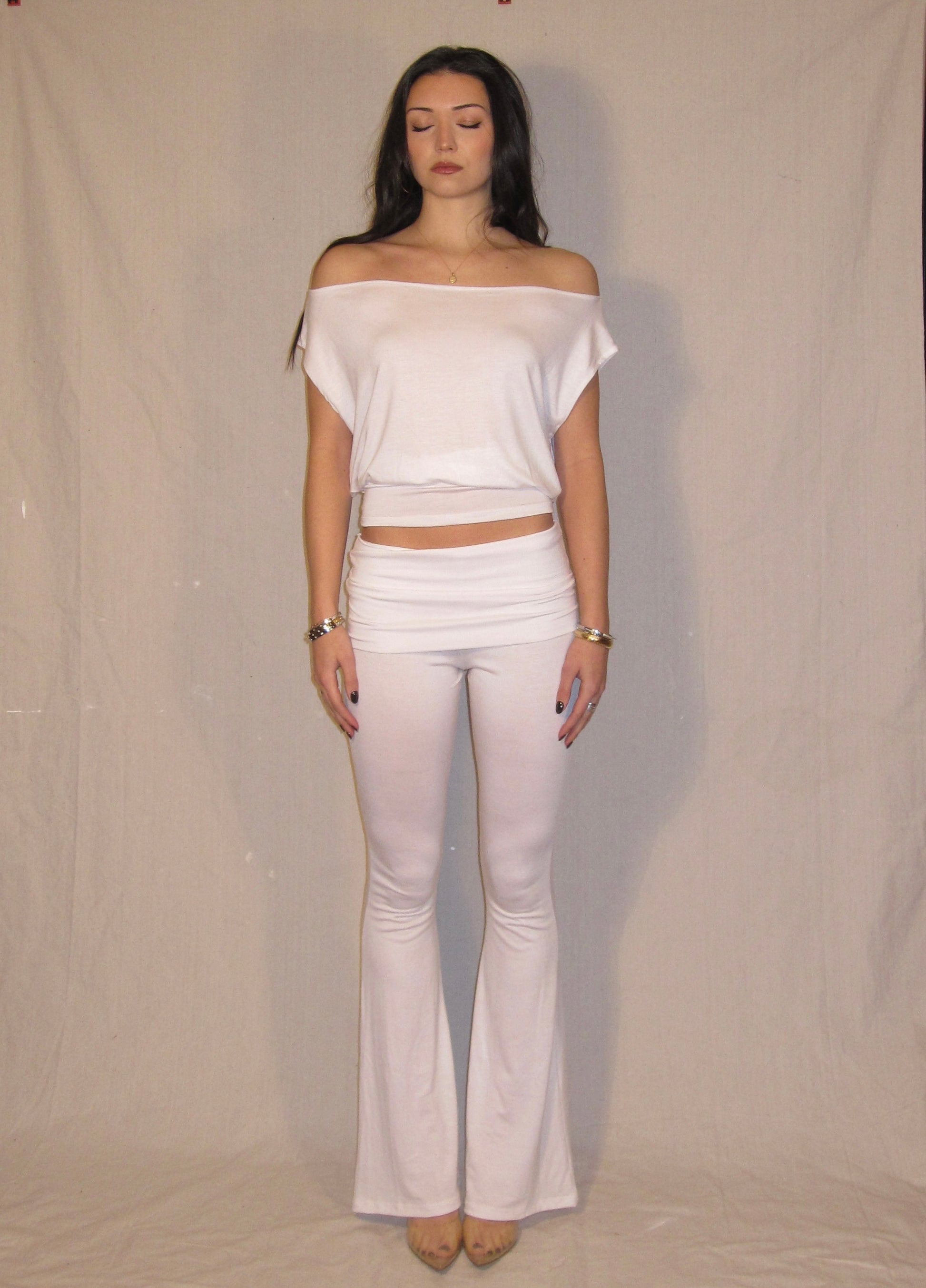 White fold over boot cut pants. Constructed using lightweight cotton fabric 92% Cotton 8% Spandex.
