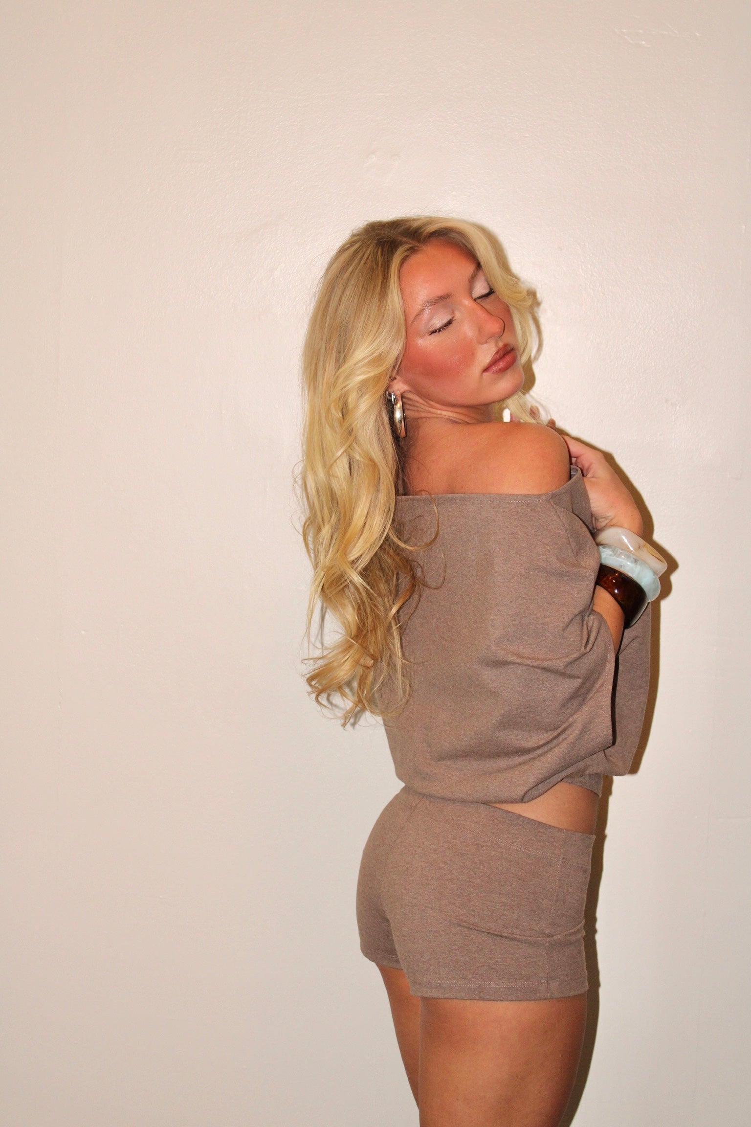 Slouch off the shoulder top and mid/low rise micro shorts set. Constructed using medium weight oatmeal beige knit fabric. 60% Modal 35% Polyester 5% Spandex.