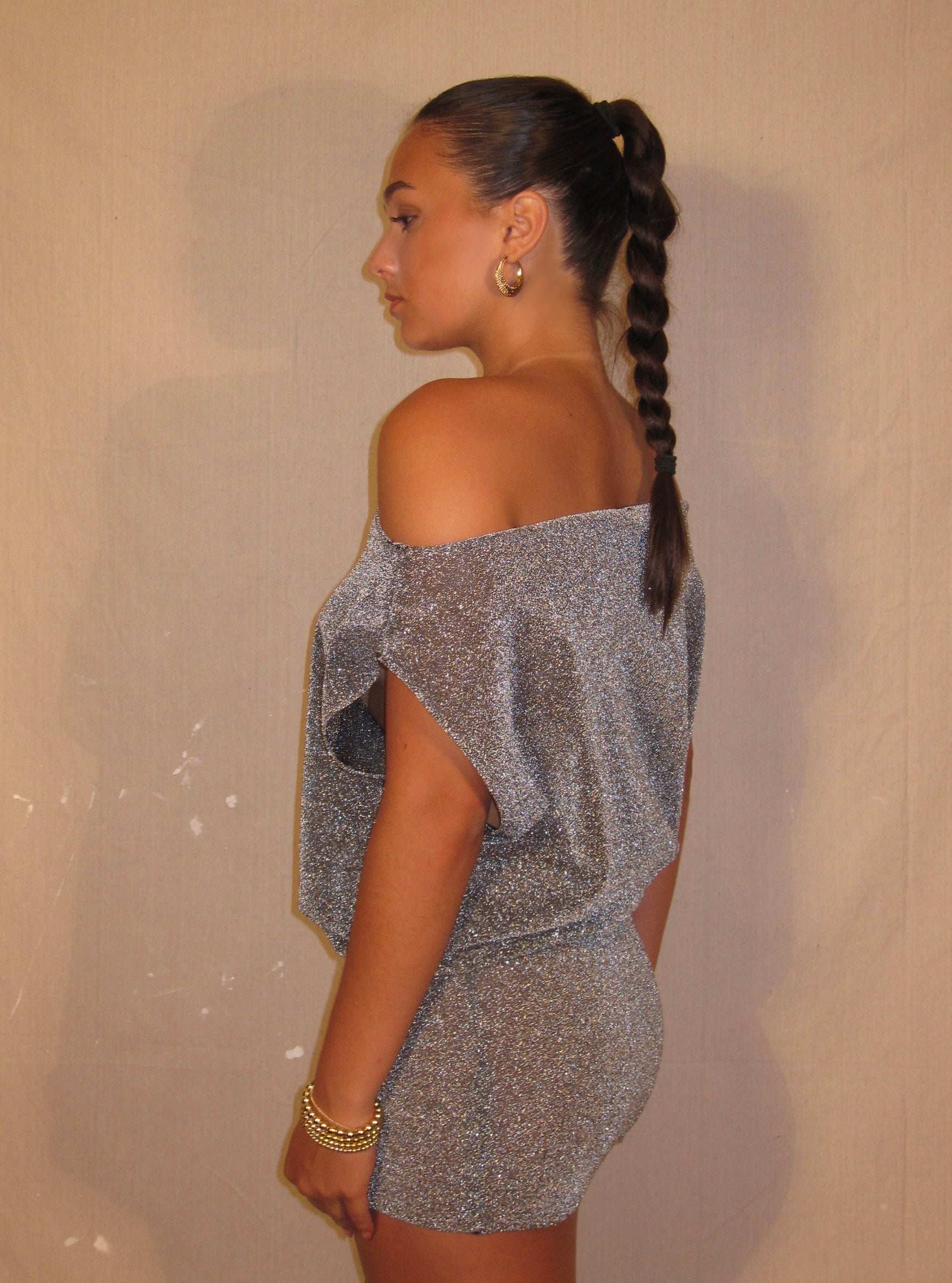 HANDMADE off the shoulder dress, constructed using metallic black knit. 64% nylon, 36% metallic. Fabric is slightly sheer!