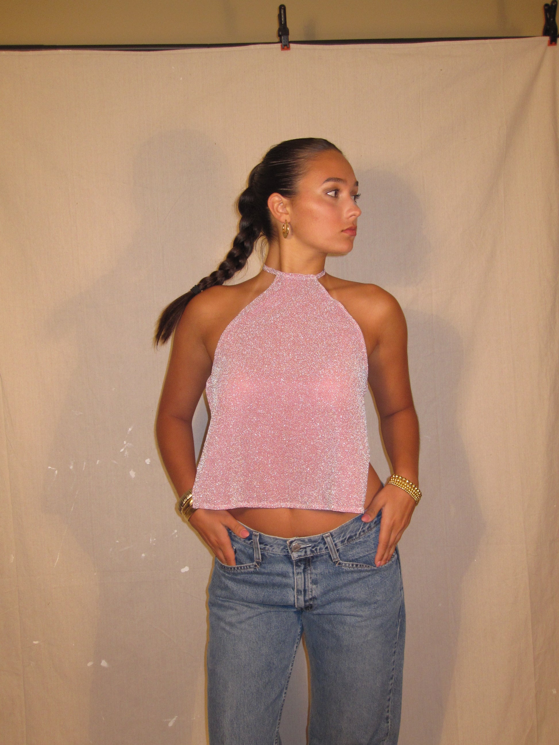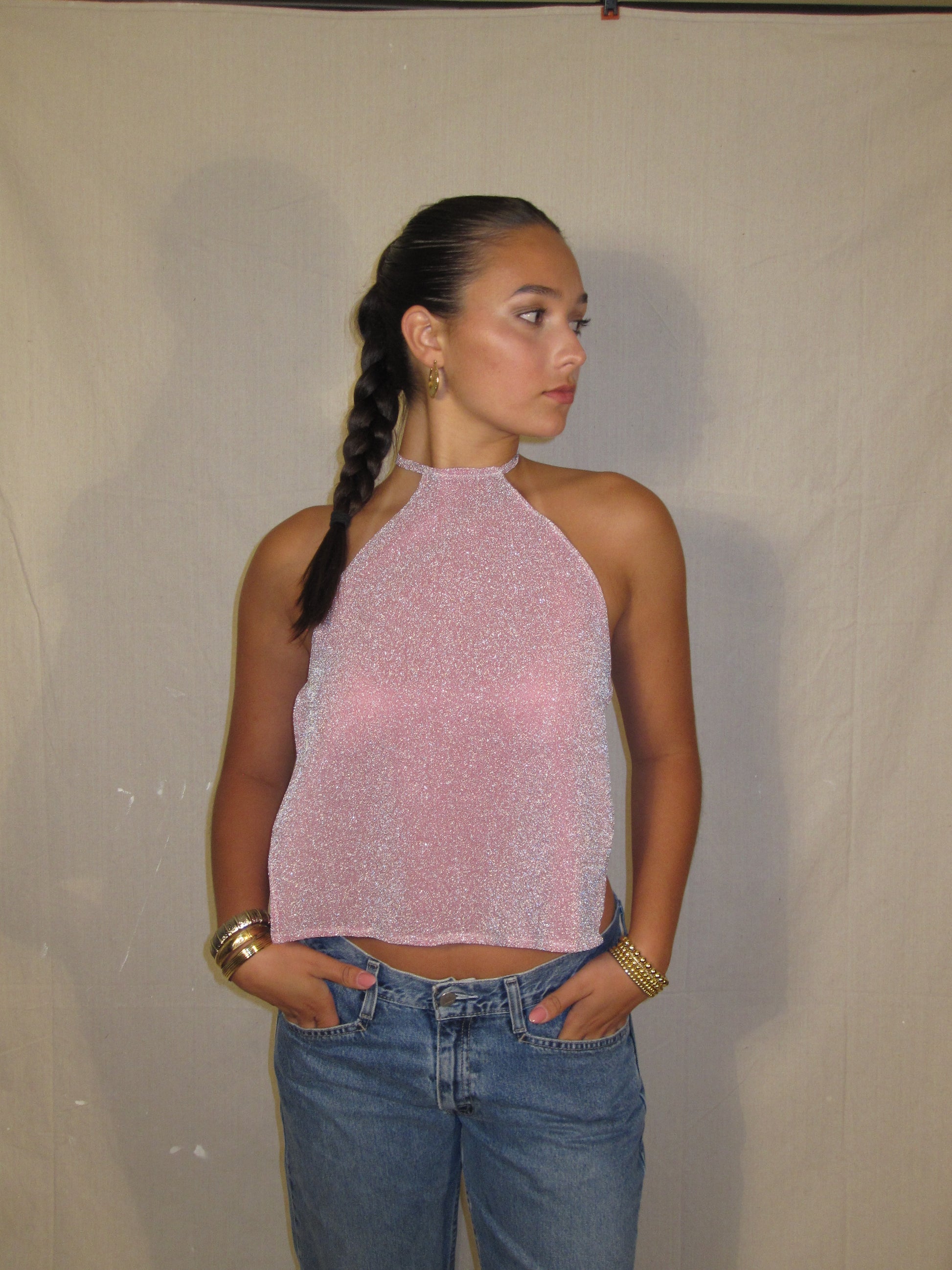 HANDMADE tie back halter top, constructed using pink metallic knit. 64% nylon 36% metallic.