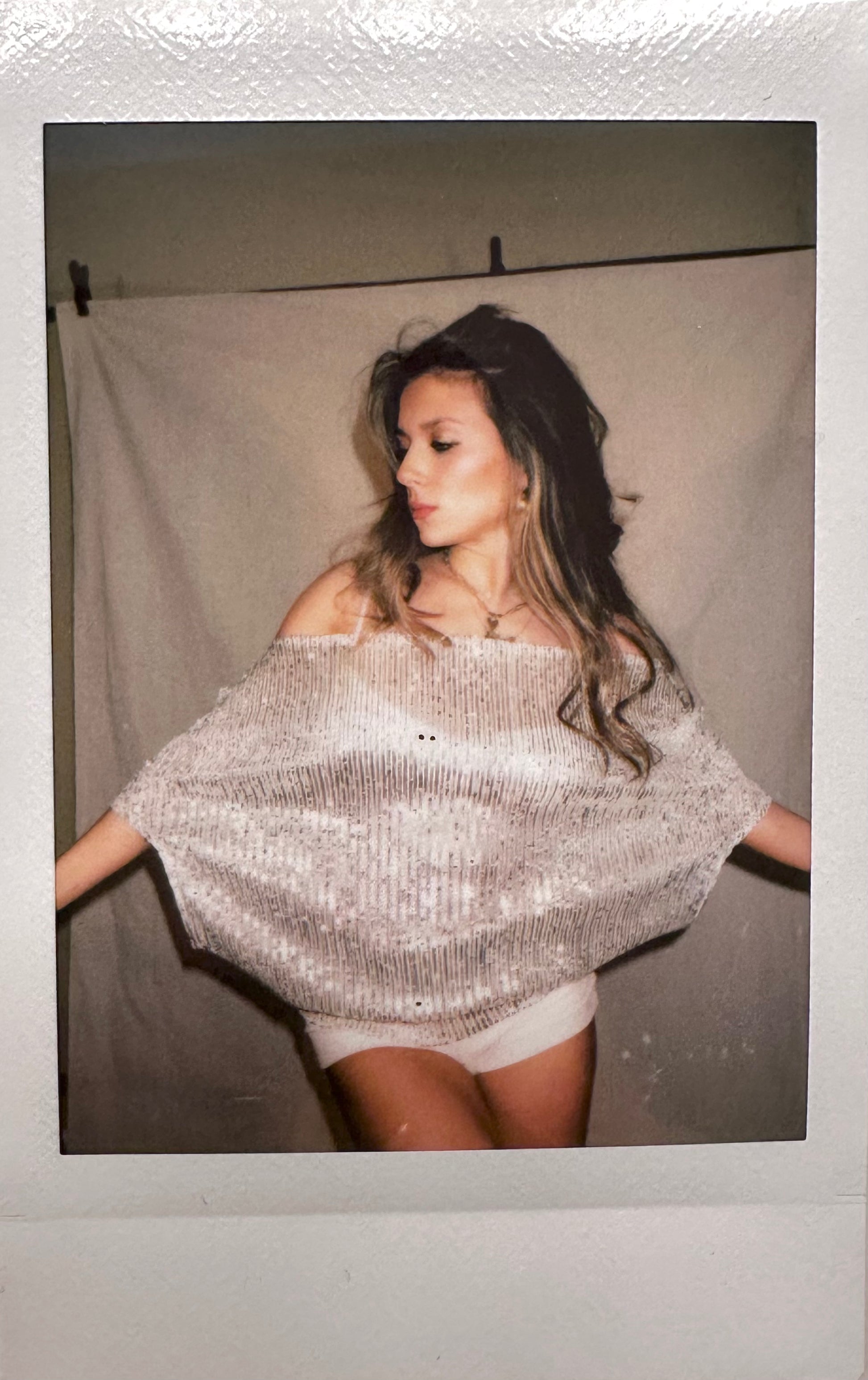 Off the shoulder slouch top constructed using silver stretch mesh sequin fabric, 93% Polyester, 7% Spandex.