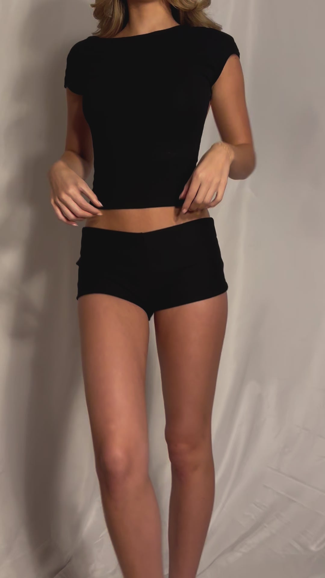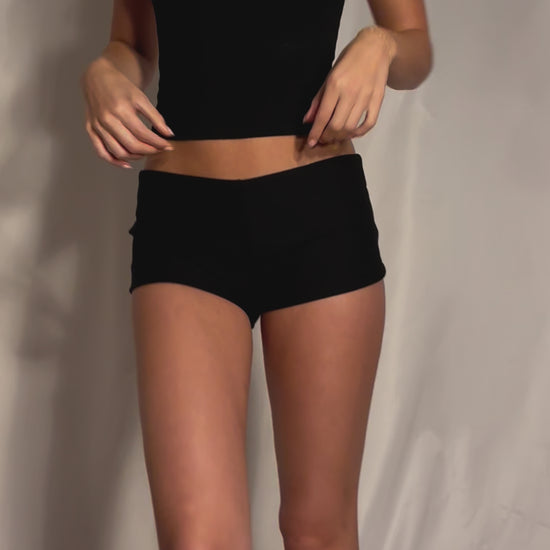 HANDMADE black micro shorts. Constructed using 70% rayon 25% polyester 5% spandex fabric.