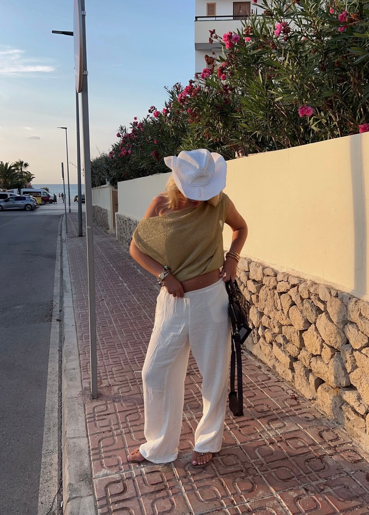 Slouch off the shoulder top, constructed using metallic knit gold. 64% nylon and 36% metallic. Fabric is slightly sheer!