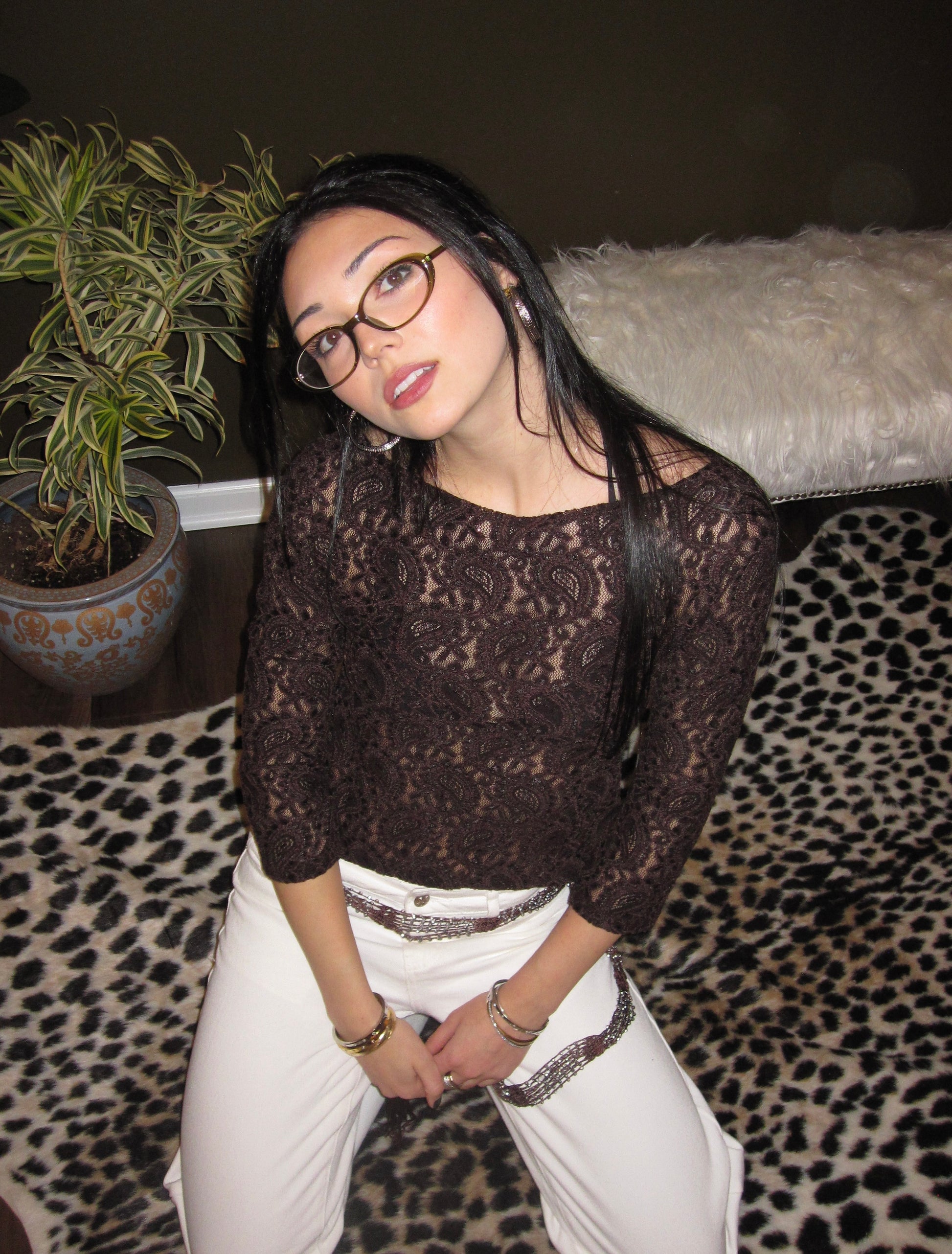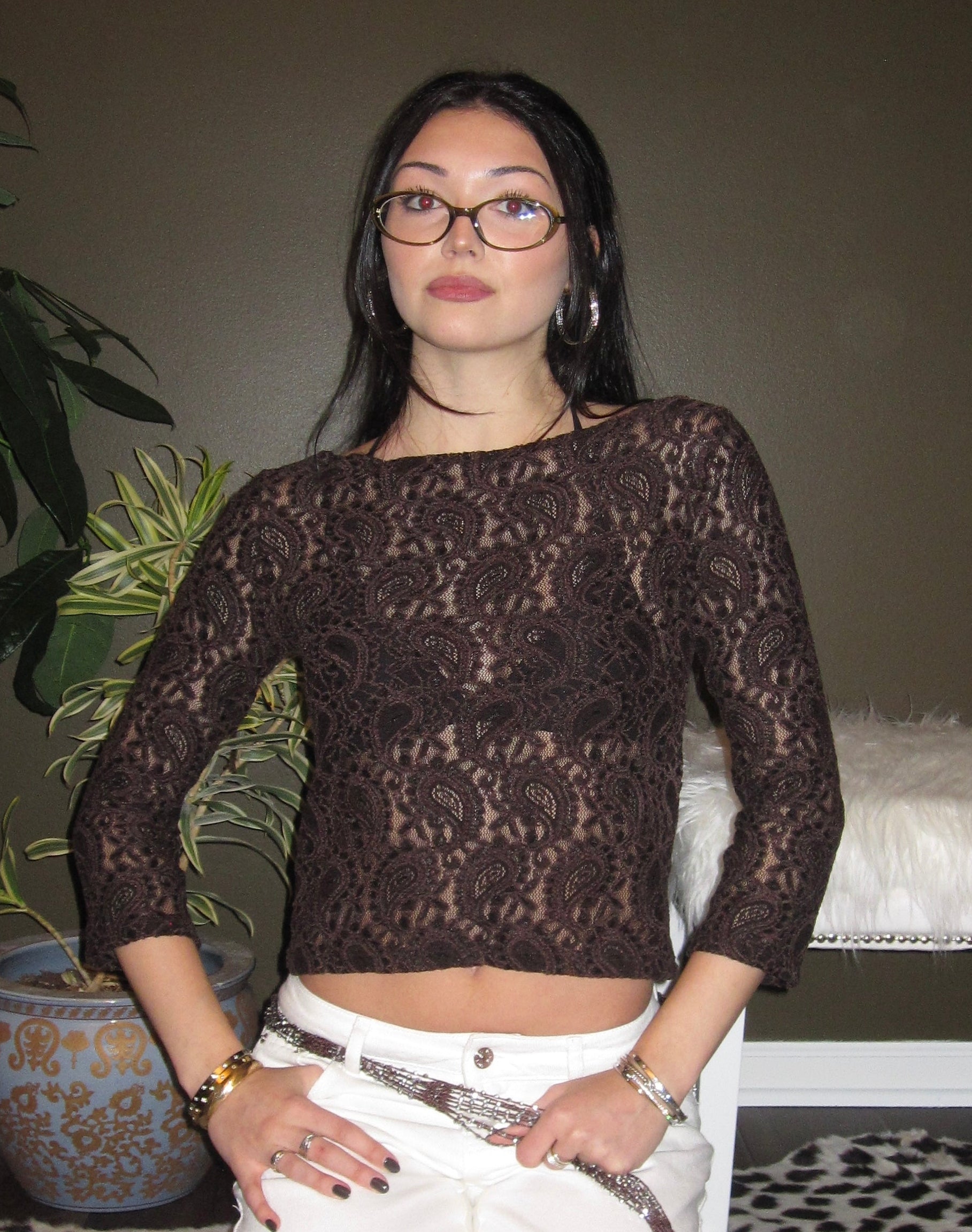 Brown floral boat neck 3/4 sleeve top. Constructed using stretch floral lace fabric 90% Polyester 10% Spandex.